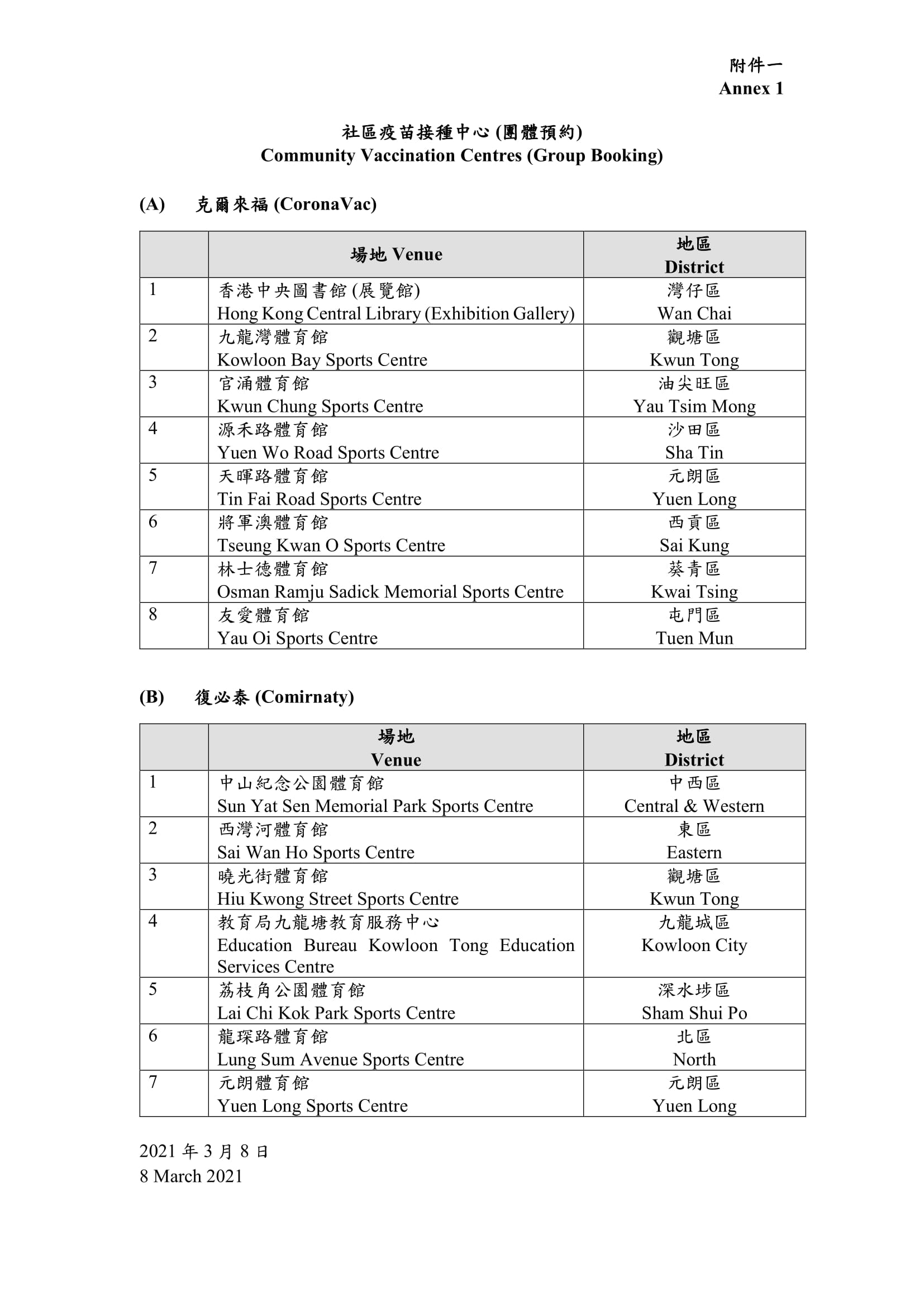 Of vaccination booths 醫療機構 medical organisations 地區 district 地址 address 提供疫苗 vaccine provided 1 中山紀念公園體育館 sun yat sen memorial park sports centre 分享 •上环中山纪念公园体育馆 •荔枝角公园体育馆 •教育局九龙塘教育服务中心 •西湾河体育馆. 場地 venue 疫苗接種間 數目 no. 律政司司长郑若骅资深大律师和教育局局长杨润雄今日(三月十七 日)到访教育局九龙塘教育服务中心社区疫苗接种中心,视察中心的运 作情况,并为中心的工作人员打气。 郑若骅和杨润雄听取中心主任介绍该中心的运作情况,并与医护和 工作人员交谈,欣悉.